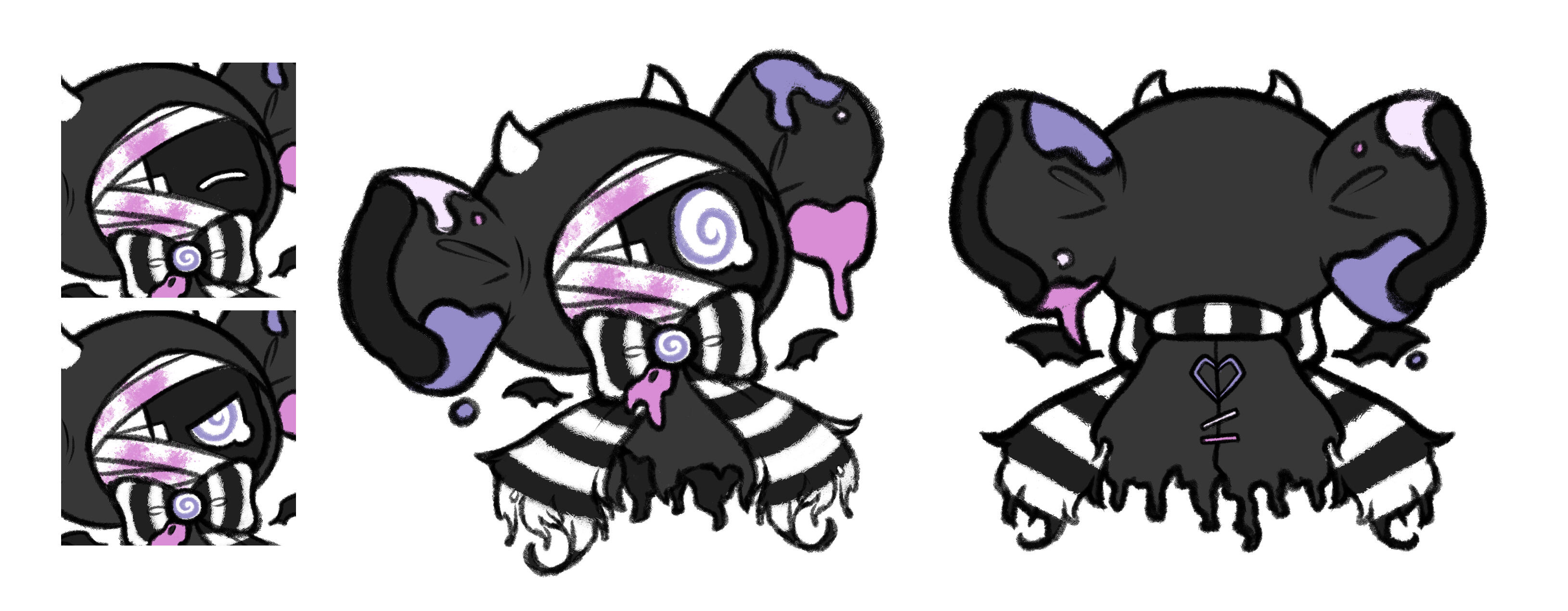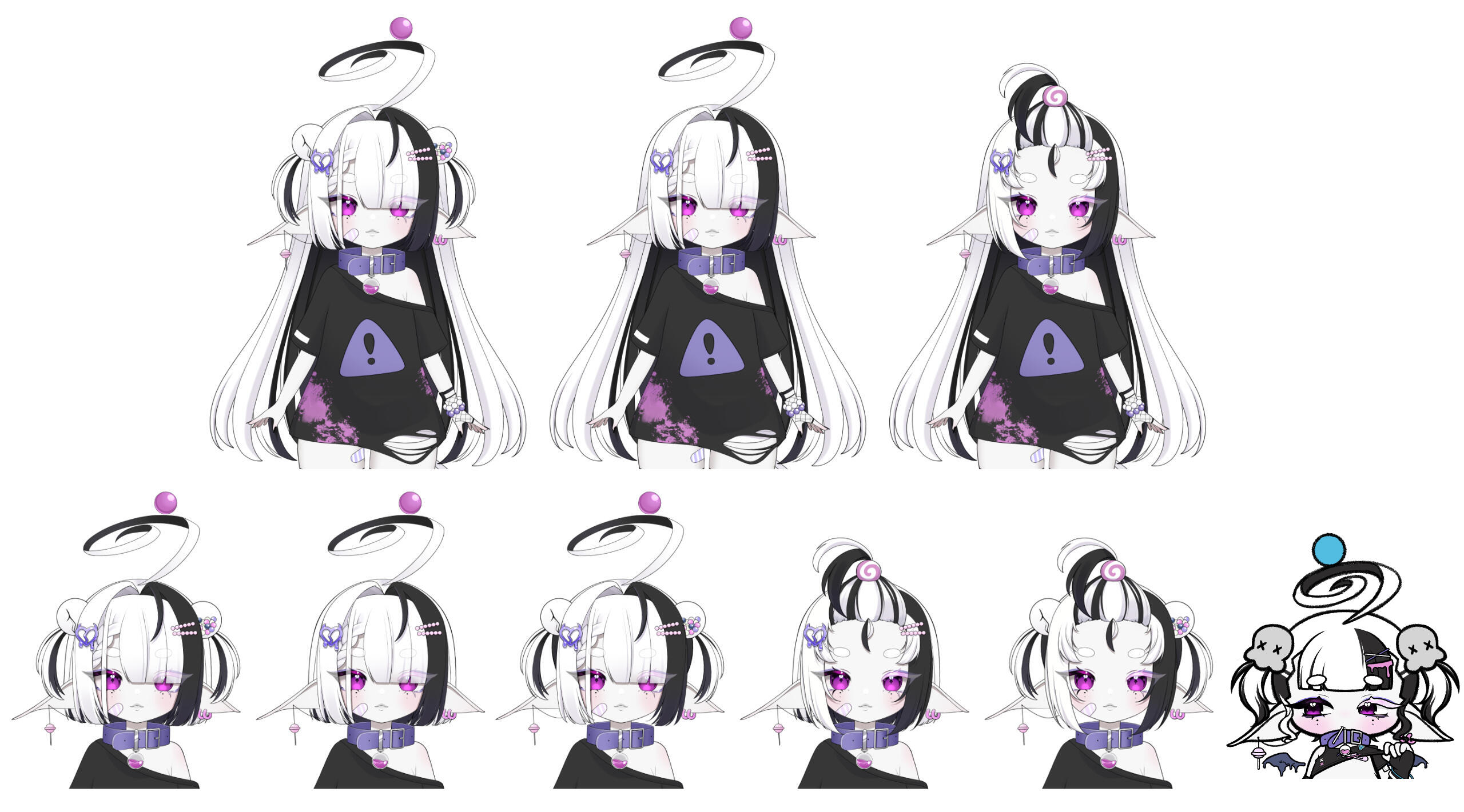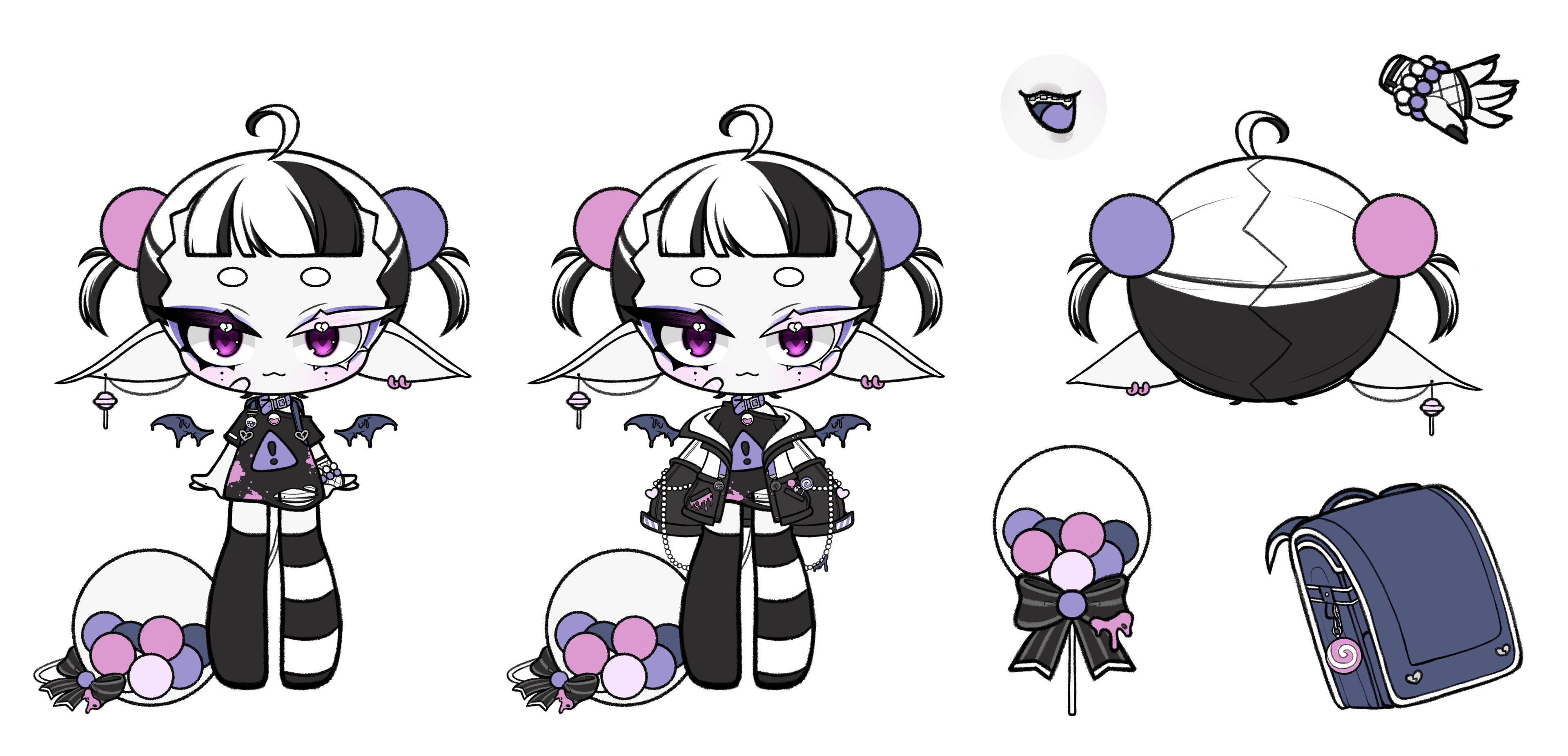 | ♡ height・140cm (with ahoge) , small and cute appearance !! | ♡ the skin is a light grey , almost snow white .. facial moles are very important !! | ♡ central themes are candy , slime / goo , teeth, dizzy swirls, and warning sign |