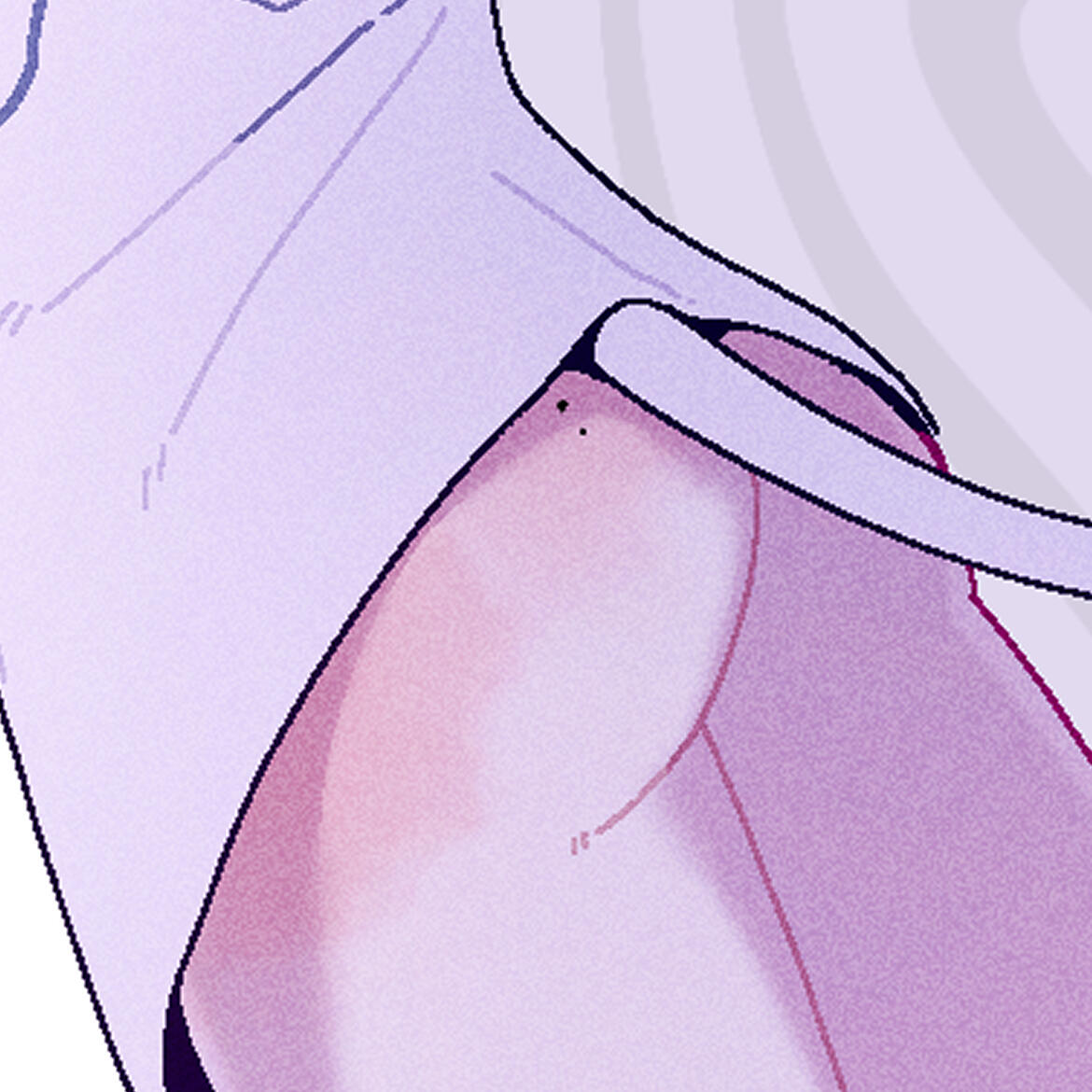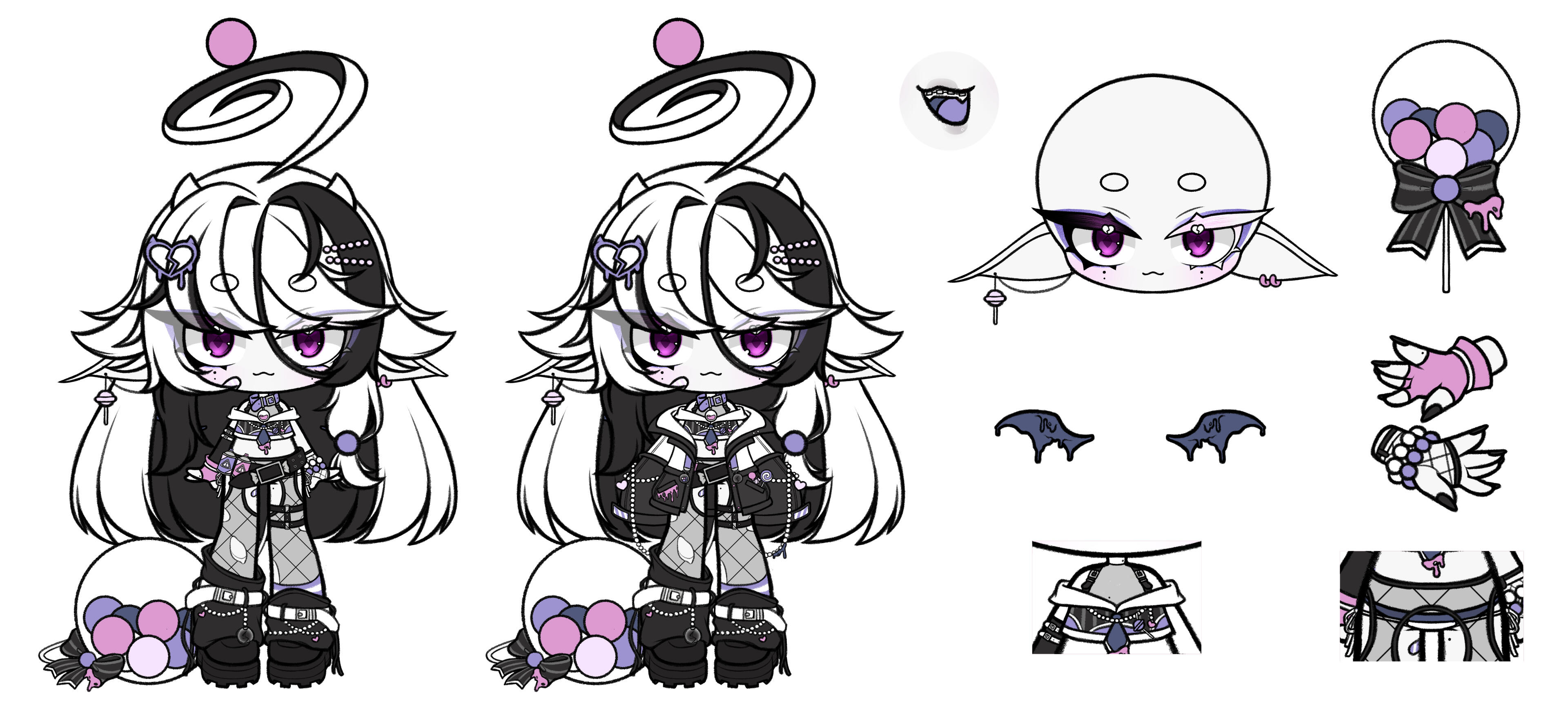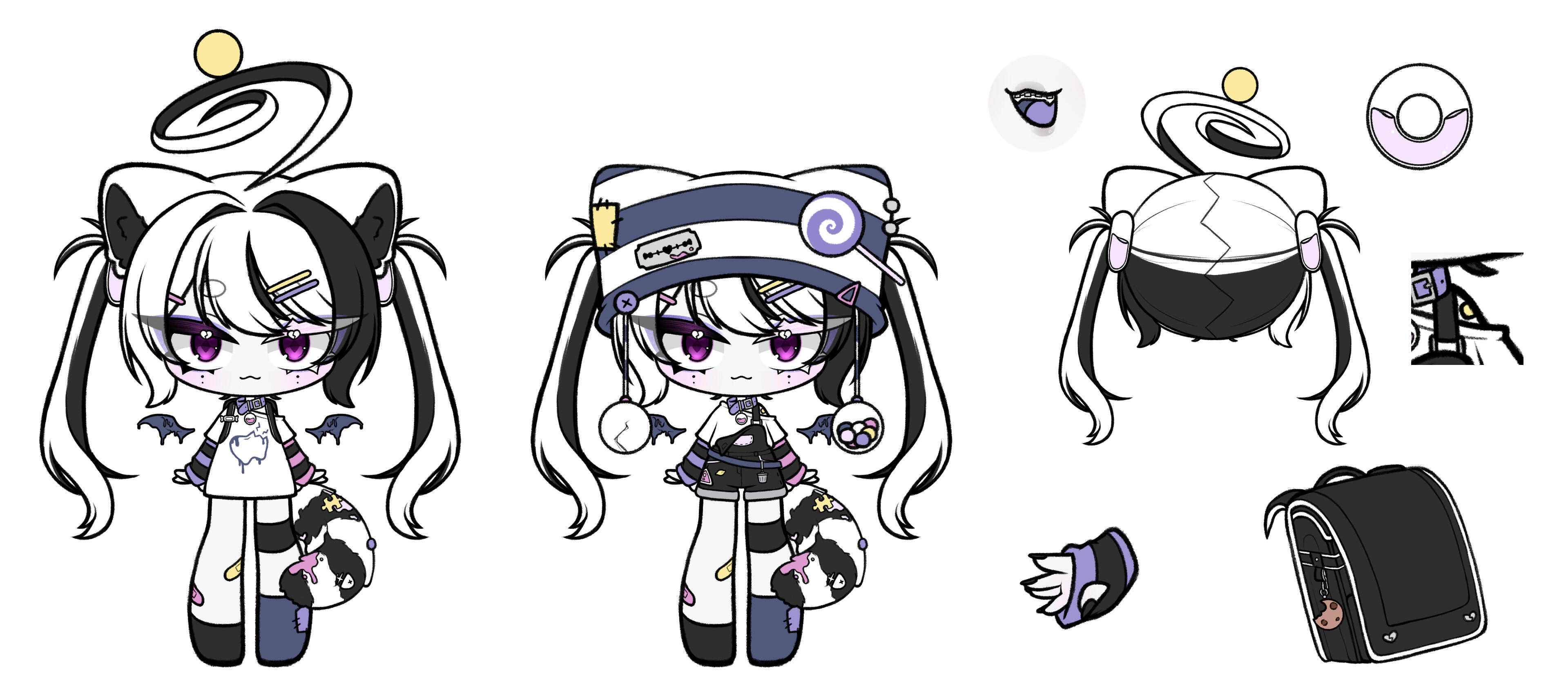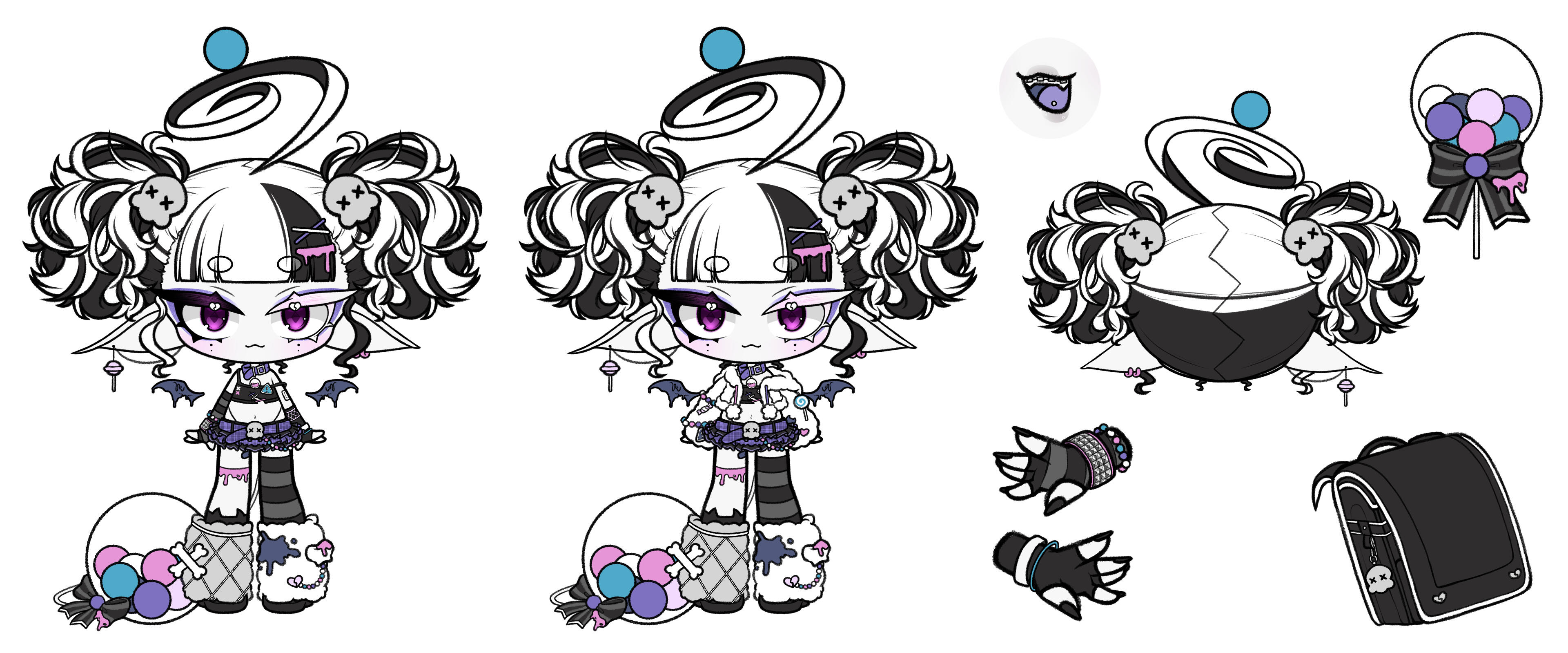 | ♡ body・completely flat chest , plump thighs .. squishy !! | ♡ her ears are different length + pointed down .. neck collar should be oversized and loose | ♡ the candy inside the tail , hair bubbles , etc. can all be drawn large !! |